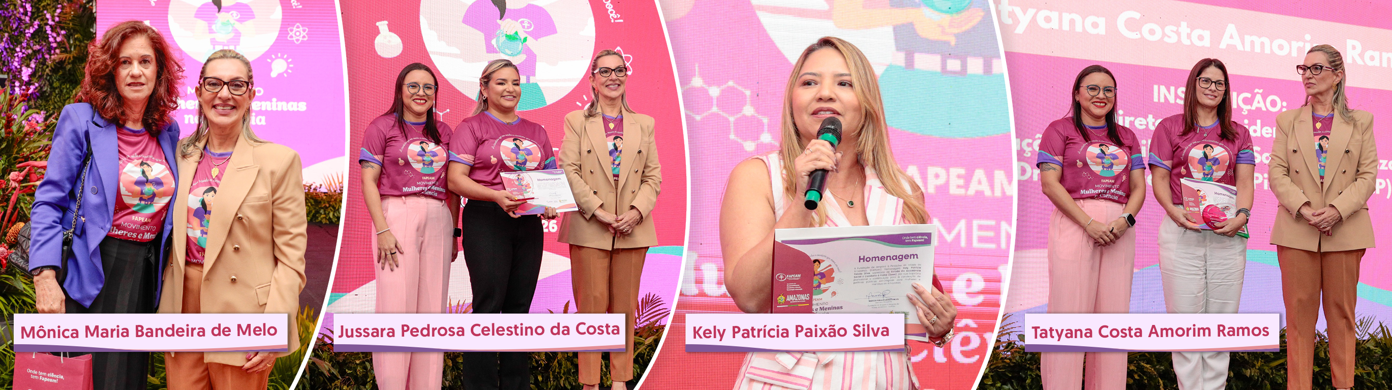 As cientistas homenageadas por sua trajetória científica desde a Iniciação Científica Júnior ao Doutorado foram: Emilly Juliana Sales Pereira de Lima, doutoranda em Biodiversidade e Biotecnologia pela Universidade do Estado do Amazonas (UEA); Mariana Vieira Mitozo, doutora em Estudos de Literatura: Literatura Comparada e pesquisadora da Universidade do Estado do Amazonas (UEA); e Jéssica Cristian Nunes dos Santos, doutora em Ciências do Ambiente e Sustentabilidade na Amazônia pela Ufam.